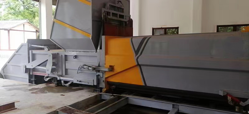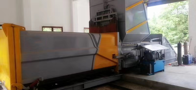 主機箱體包含:主機箱體、壓縮倉、壓頭、壓縮油缸、滑輪、液壓系統、電控系統等組成。其主要結構件采用Q345高強度結構鋼焊接成成,具有較有的耐磨性;主機箱體上的滑輪與滑臺導軌配合,使主機能相對滑臺滑動,液壓電控系統固定安裝于主機箱體上,整體簡潔美觀。箱體容積18m3,匹配20噸后雙橋車廂可卸式垃圾車。