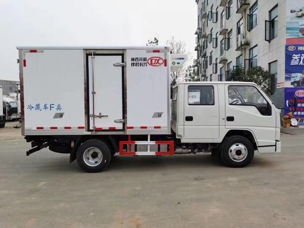 江鈴順達雙排冷藏車,整車型號:AAA5043XLCJX6,整車尺寸:5995×1980×2900,廂體尺寸:3250×1800×1800,五十鈴115馬力發動機,5檔變速箱,原廠空調,助力,ABS,油剎,軸距3360,7.00R16LT 8PR輪胎,廂體采用內外玻璃鋼、中間8CM 厚聚氨酯保溫板、底板為防滑花紋鋁板,單開側門,不銹鋼門鎖件,-15度制冷機組,其余標配。